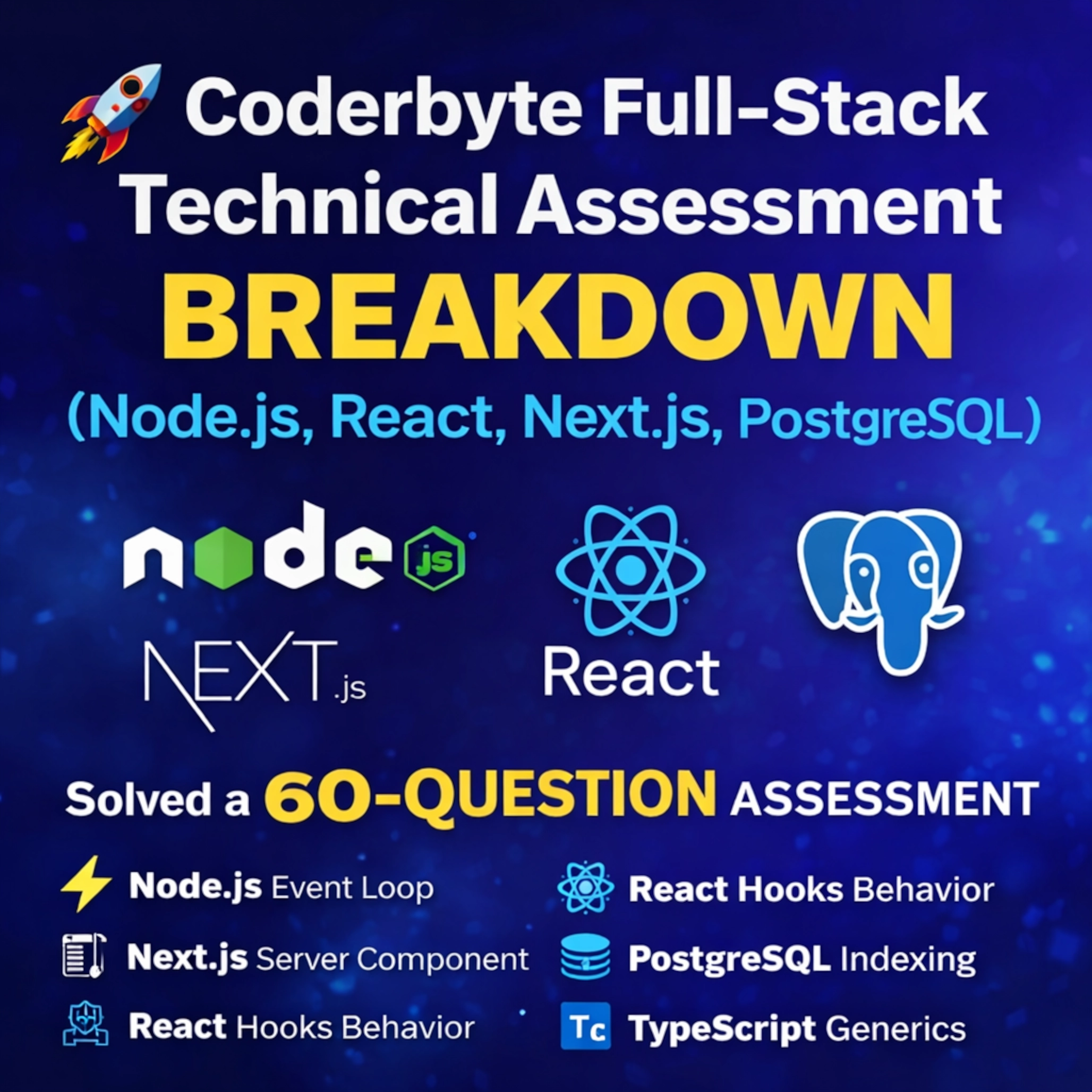 Technical assessments are becoming increasingly common in modern software engineering hiring pipelines. Recently, I completed a Coderbyte technical assessment consisting of 60 questions covering full-stack topics including Node.js, Next.js, React, PostgreSQL, and TypeScript.