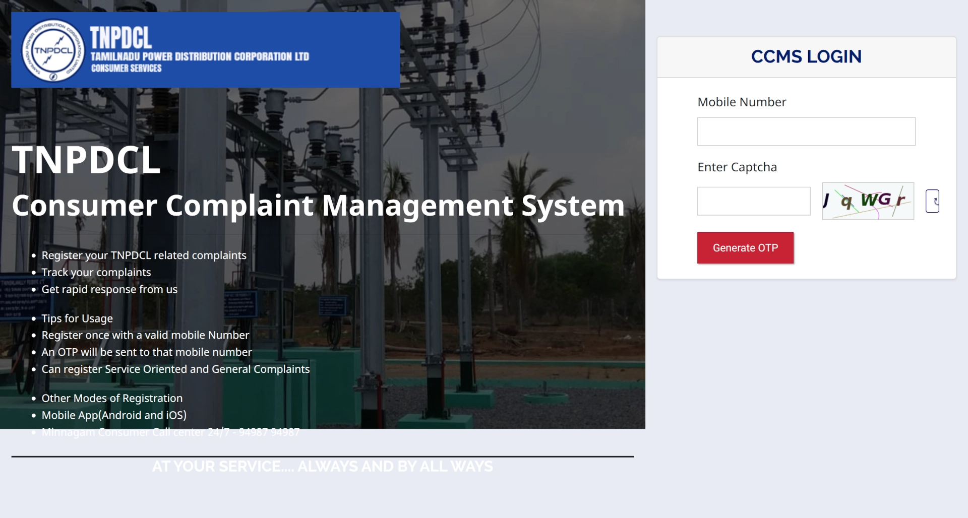 TANGEDCO CCMS enables electricity consumers to manage complaints and service requests.